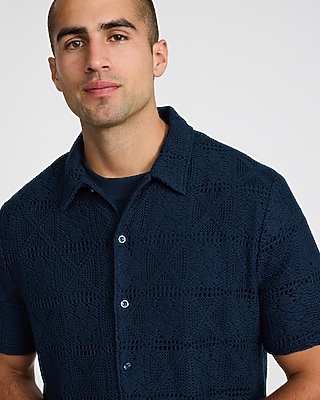 A short sleeve cotton-blend sweater polo complete with a point collar, a full button front, and a textured floral print.