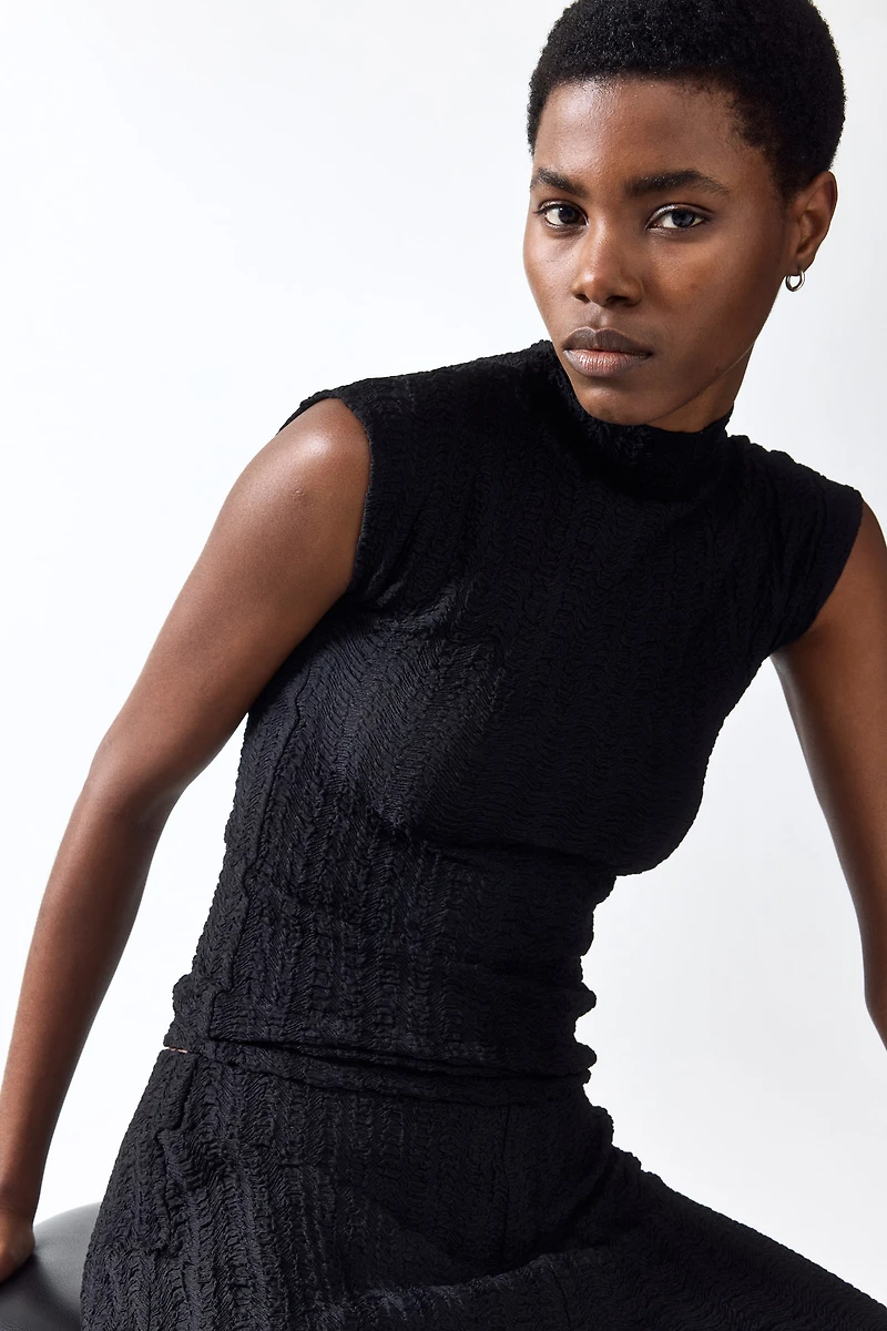 Mock turtleneck top in textured jersey. Keyhole opening at back with button, cap sleeves, and a straight-cut hem.
