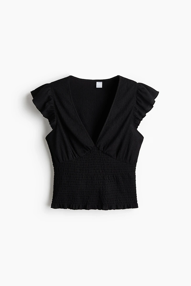 Fitted top in textured jersey. V-neck, gathered seam below bust, smocked lower section, and short flutter sleeves. Ruffle-trimmed hem.
