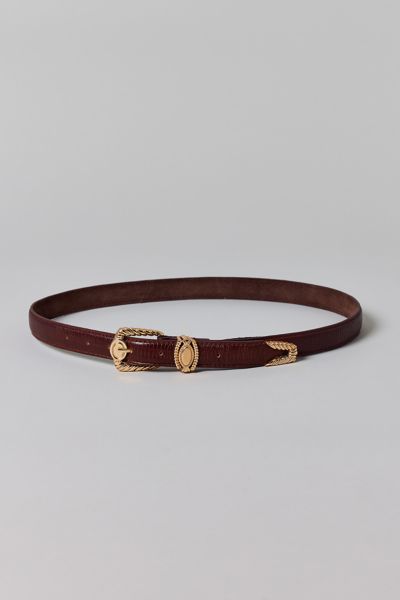 Slim leather belt with a textured finish. Complete with antiqued silver metal details for a western aesthetic.