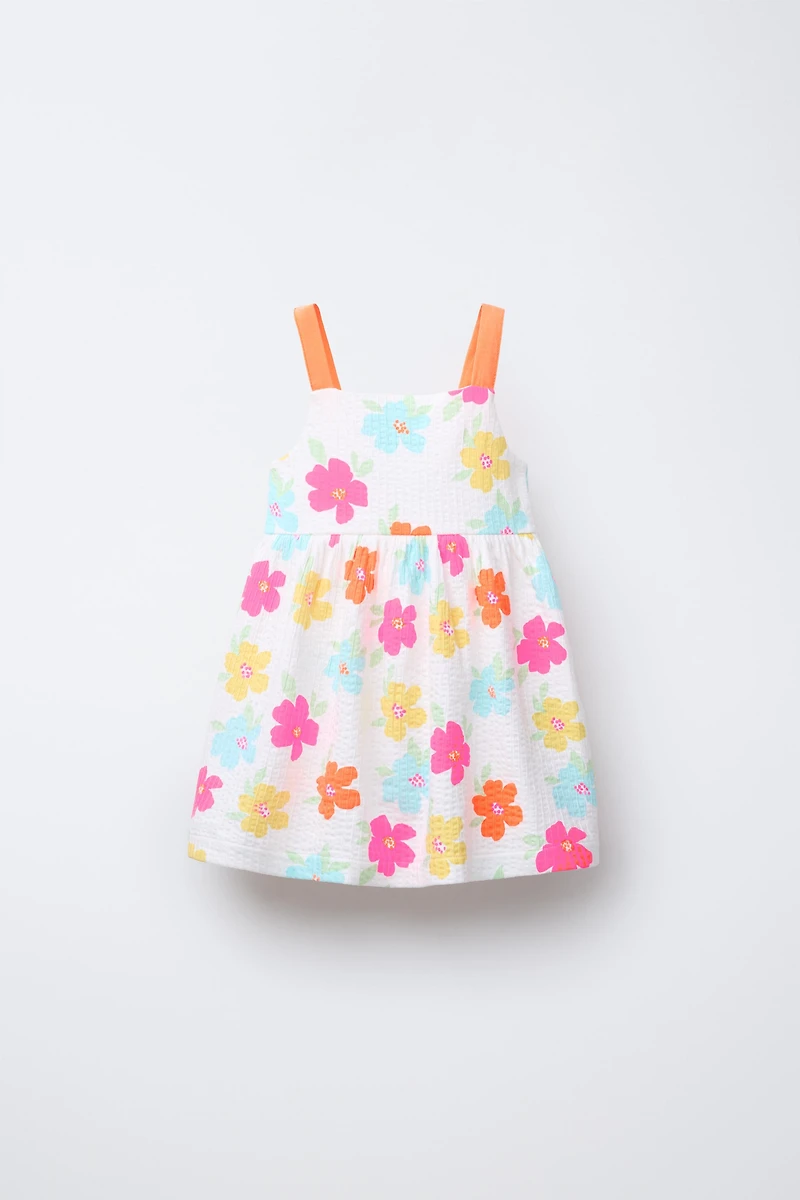 Dress with a straight neck and straps. Cut-out detail on the back with a bow appliqué. All-over print. Fabric: 96% cotton.
