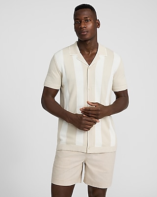 A breathable cotton sweater polo complete with a camp collar, a textured vertical stripe print, short sleeves, and a full button front.
