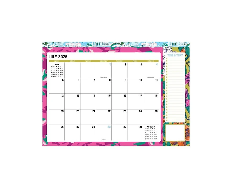 Simple but never boring, this 12-month academic year desk pad calendar is perfect for your dorm, office space or kitchen counter! Classic page design with a bright neon border makes planning easy. The monthly, tear-off pages boast large daily grid space plus, a this and that checklist section and a view of the previous and upcoming month. This calendar spans July 2026 - June 2027 and is made of high quality, thick paper allowing for smooth writing and easy erasing to keep your schedule up to date. This 17" (w) x 12" (h) landscape-oriented calendar is a modest size that can either lay flat on a desk or hang on the wall by the drilled hole. Boxes measure 1.9" (w) x 1.7" (h).