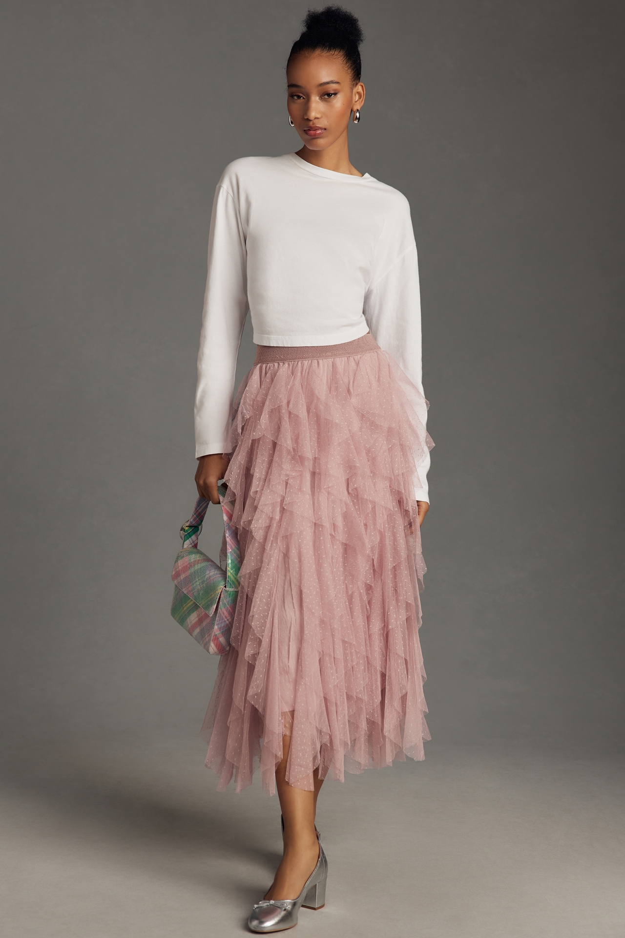 The Chéri is a oui. This top-rated midi skirt features a waterfall of tulle ruffles and delicate, swiss dot embellishments.