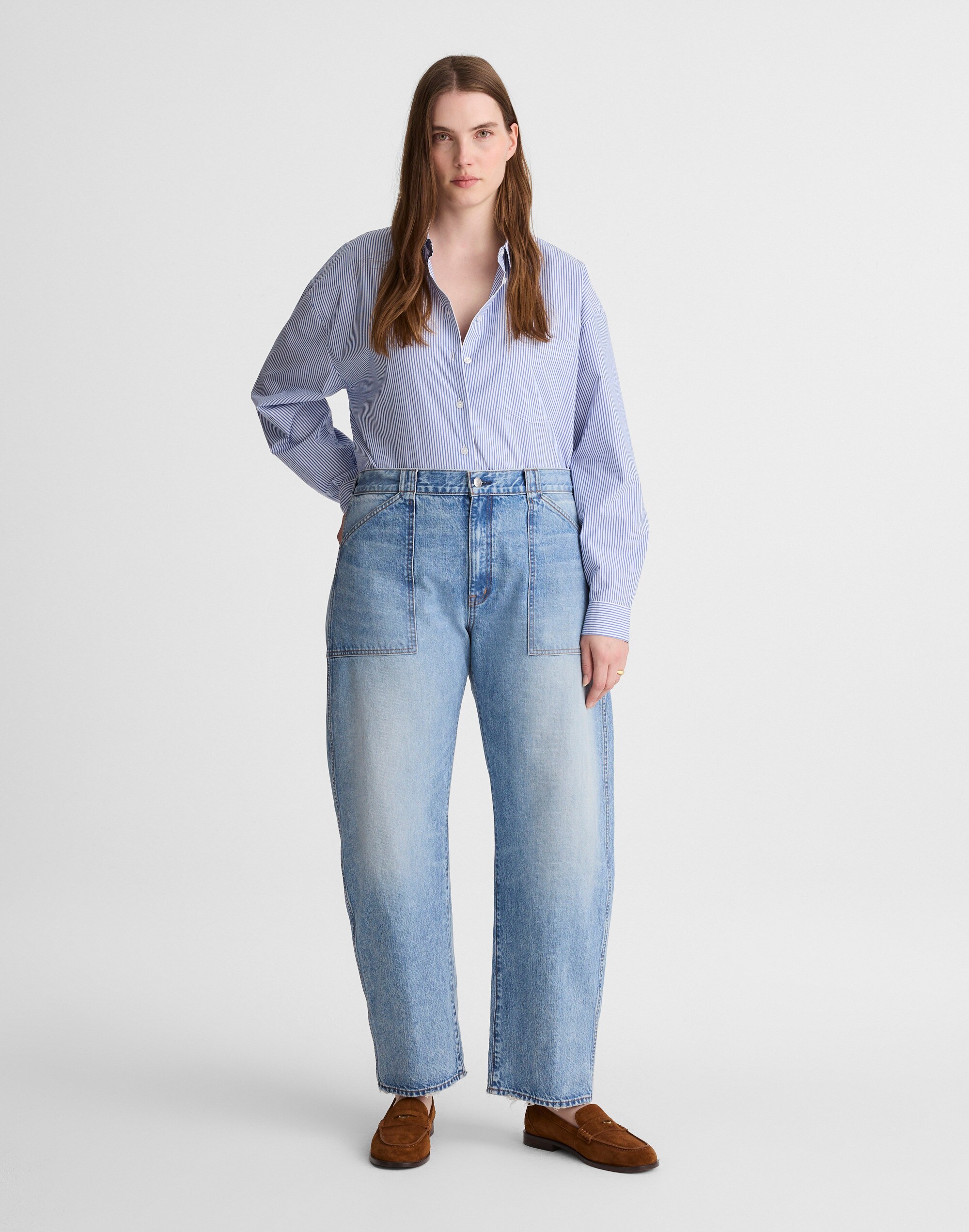 The cut: easy through the hip and thigh with a full-length inseam, these on-trend jeans feature a high rise, utilitarian-inspired pockets and exaggerated barrel-leg shape. This pair is designed for an hourglass shape (see: narrower waist with a contoured band, a longer rise and a little extra room at the hips and thighs).