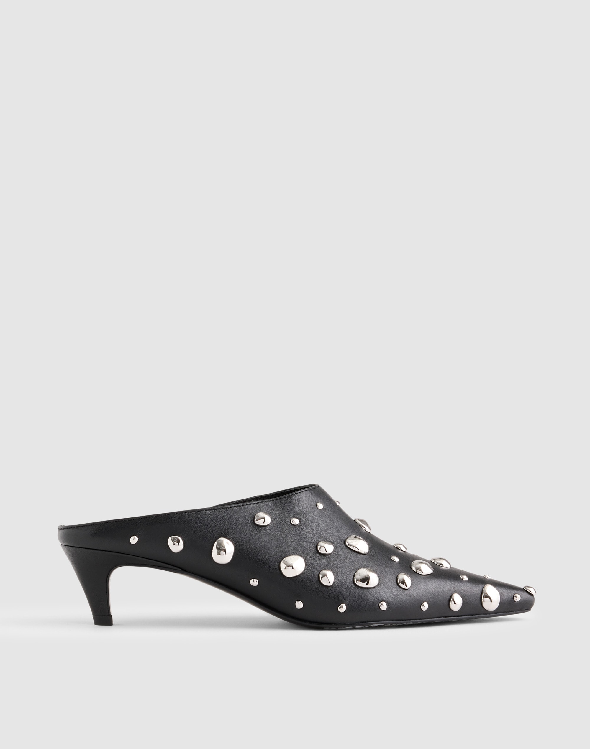 Coming in leather, these mules feature a sleek pointed toe and kitten heel. The silver-tone studs adds an edgy touch, making them perfect for both day and night looks.