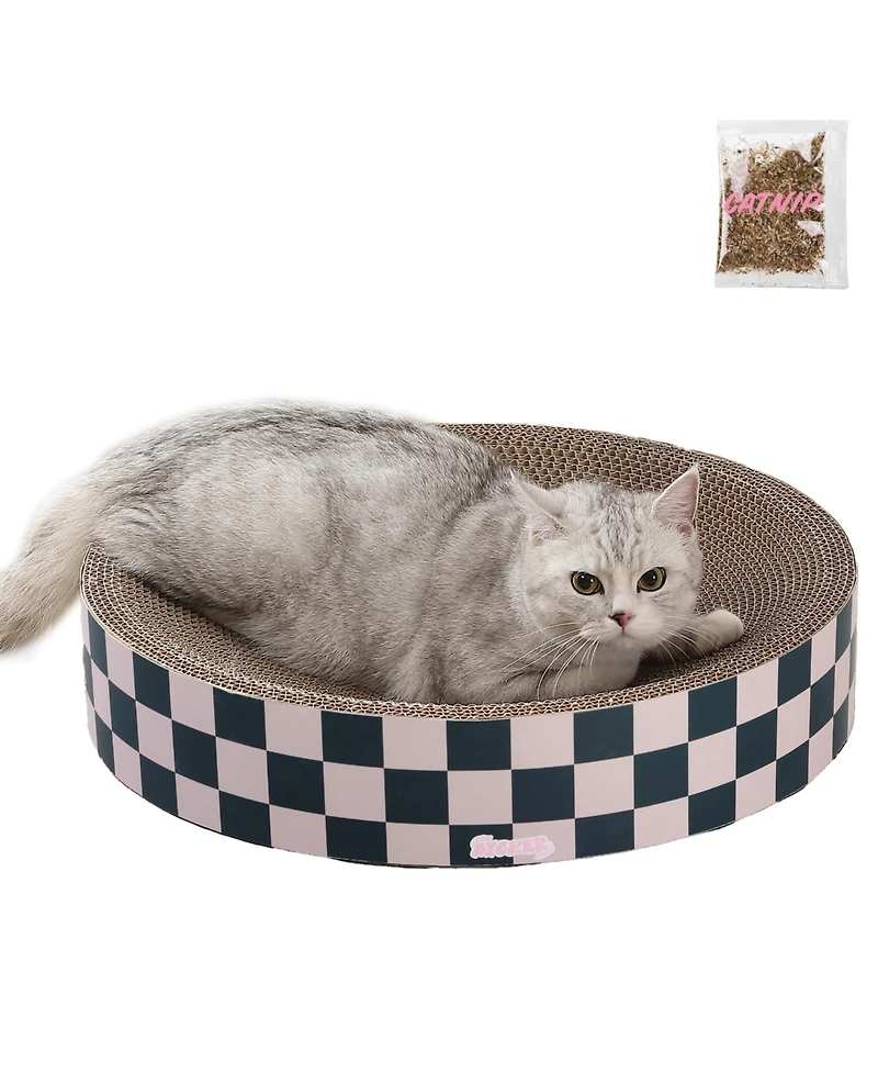 Modern and cozy cat-scratcher bowls are perfect for active scratching and relaxed snuggling. This has a corrugated cardboard interior and a checkered design around the outside. The round shape is perfect for cats that don't like a soft bed.