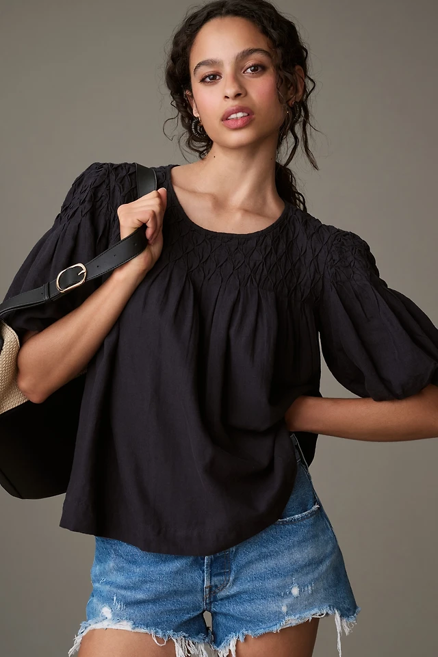 The Liza Puff-Sleeve Smocked Linen Top