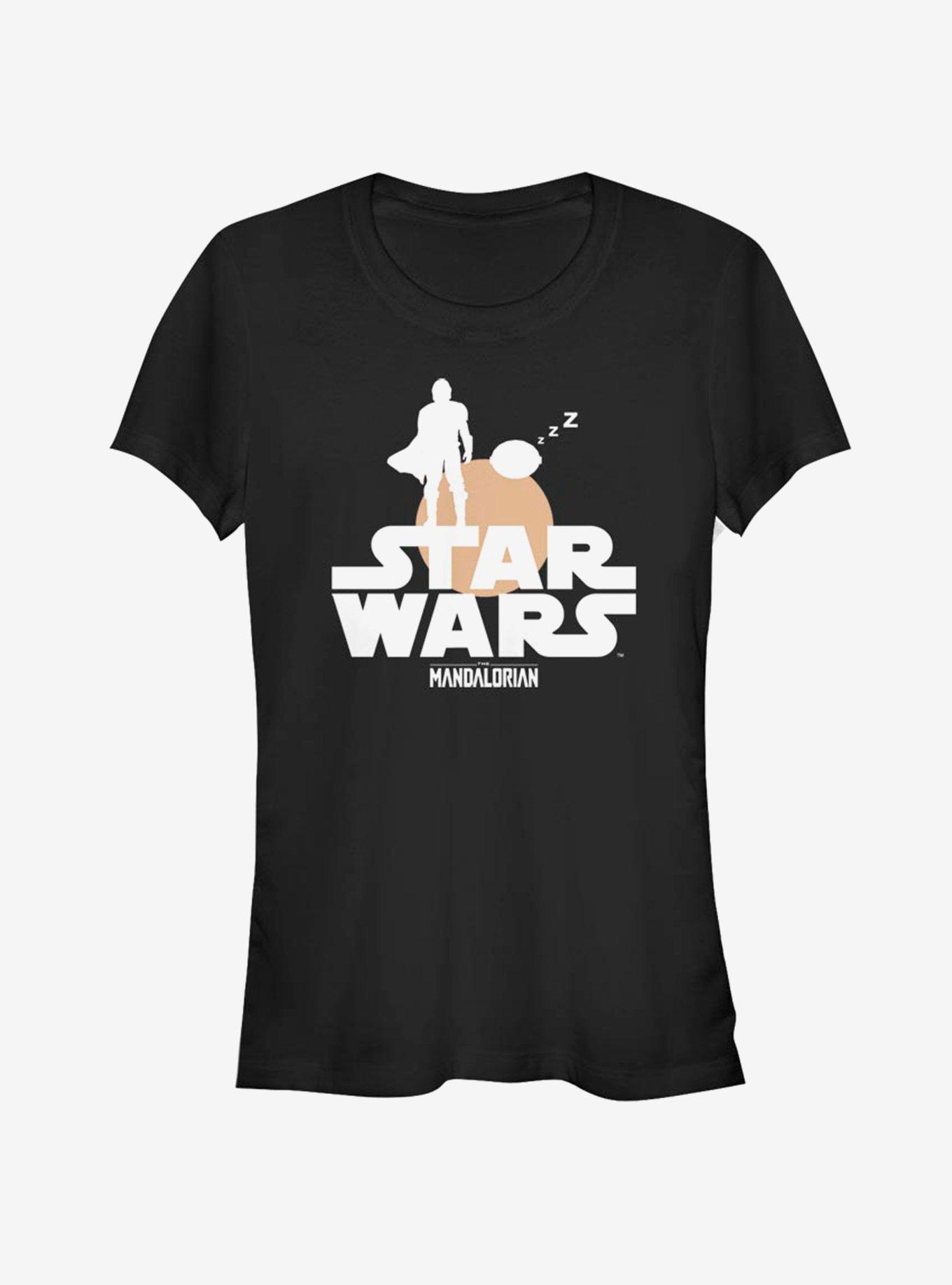 Zzz. Grogu, AKA The Child, snoozes next to Din Djarin on this fitted tee inspired by the Disney+ series Star Wars: The Mandalorian .