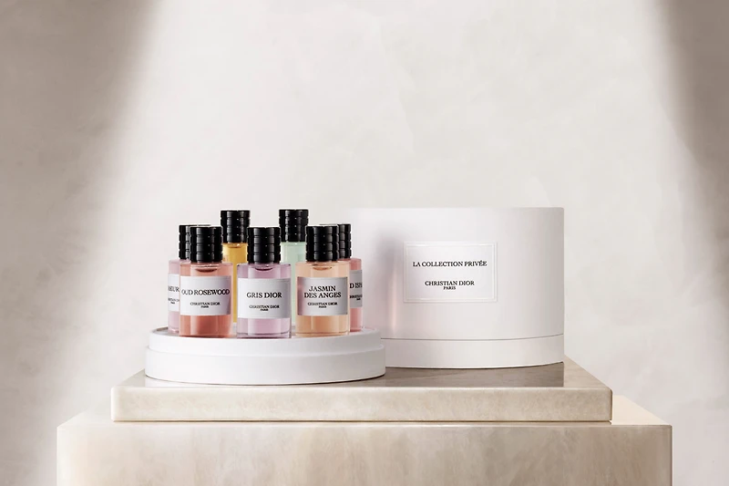 Discover the iconic fragrances from La Collection Privée Christian Dior presented in a couture set bearing the signature of the House of Dior.