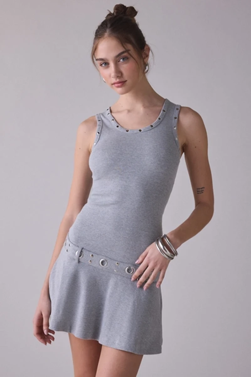 Soft knit The Ragged Priest mini dress designed in a retro drop waist silhouette. Short grey dress featuring a scoop neckline, sleeveless style, fitted drop waist bodice, belted detail that sits at the hips and a flared hem. Topped with grommet details for an edgy vibe.