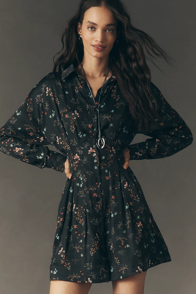 The Tobie Long-Sleeve Satin Mini Shirt Dress by Exquise