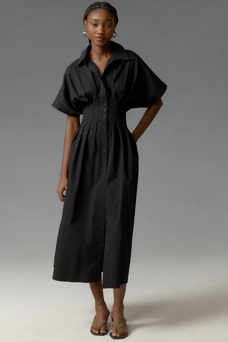 Tailored to perfection, the Tobie Shirt Dress is on top of *everyone’s* mind – with its classic collar, exaggerated sleeves, and waist-defining pleats.