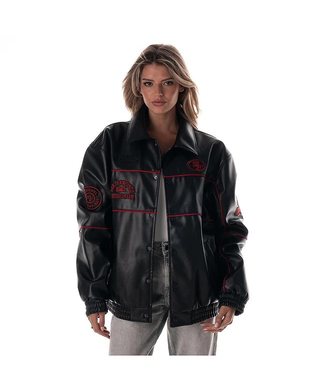 The Wild Collective Women's Black San Francisco 49ers Faux Leather Full-Snap Racing Jacket