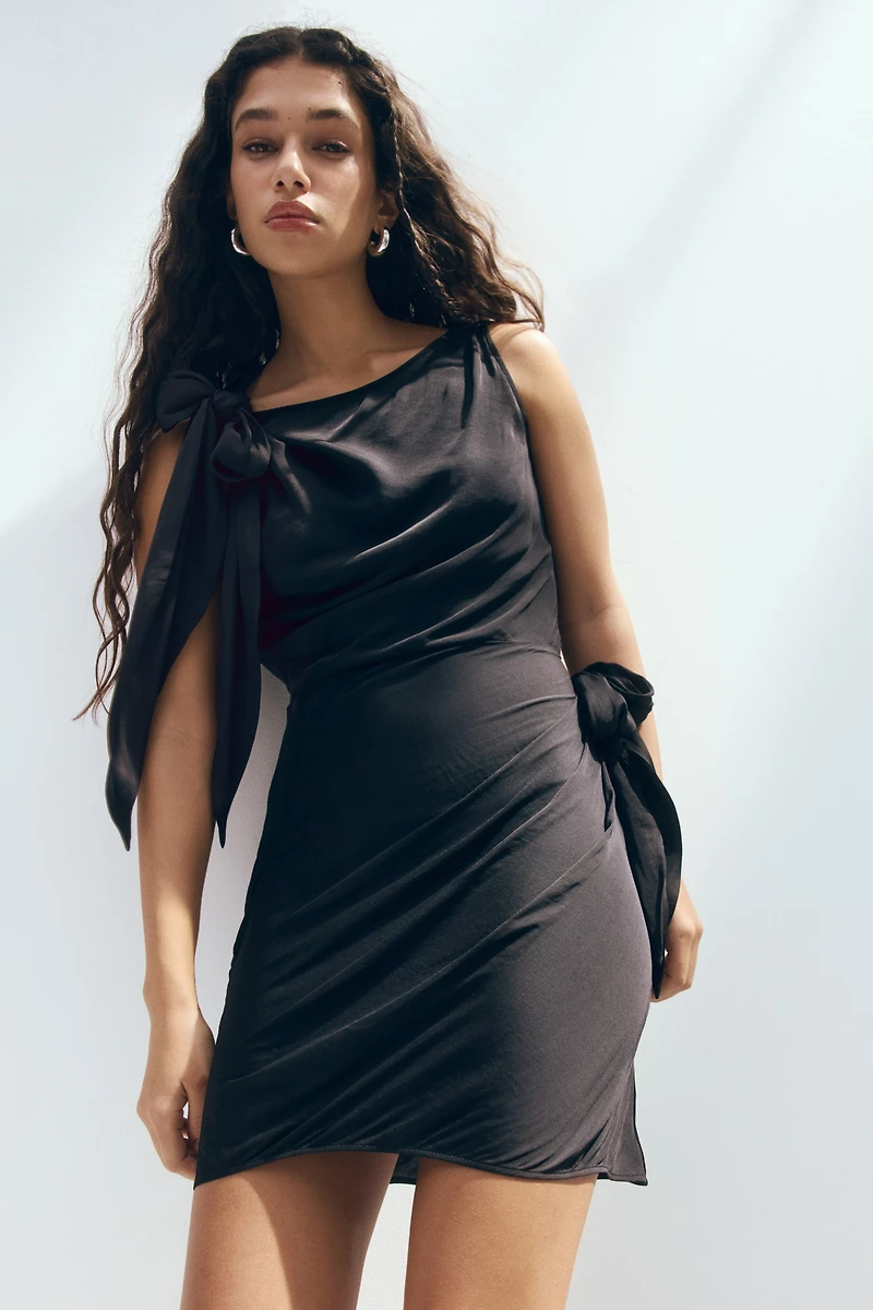 Short, fitted sleeveless dress in woven fabric with a slight sheen. Delicate boat neck, wide ties on one shoulder and at opposite side of waist, and a concealed zipper at one side. Unlined.