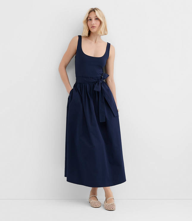 With an extra soft and stretchy cotton blend knit bodice and a woven twill tie waist skirt, this dress is instantly the best of both style worlds. Scoop neck Sleeveless Adjustable waist tie. Onseam pockets Elasticized back waist., Imported:, Length: 49 1/4"from center back top edge to hem, measured from a size 8 / M, Fabrication: Upper Body 57% Cotton 38 Modal 5 Spandex, Skirt: 100% Cotton, Garment Care: Machine Washable Loft Tie Waist Mixed Media Midi Pocket Dress Size XS Black Women's by Loft Size Regular - XS Black Women's Fit, & Flare Knit Dresses Work Upper Body: 57% Cotton 38% Modal 5% Spandex Skirt: 100% Cotton Machine Washable