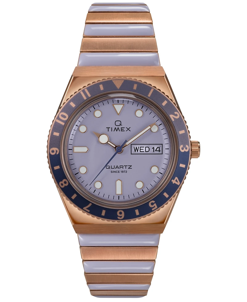 This fresh update to our Women's Q Timex offers a soft pastel colorway, with the dial, bezel, and brushed rose gold-tone stainless-steel Perfect Fit expansion band featuring sweet shades of purple. Other details include all you'd expect from our Q – a bidirectional rotating top ring, day of the week and date window, bold hour markers, and domed acrylic crystal.