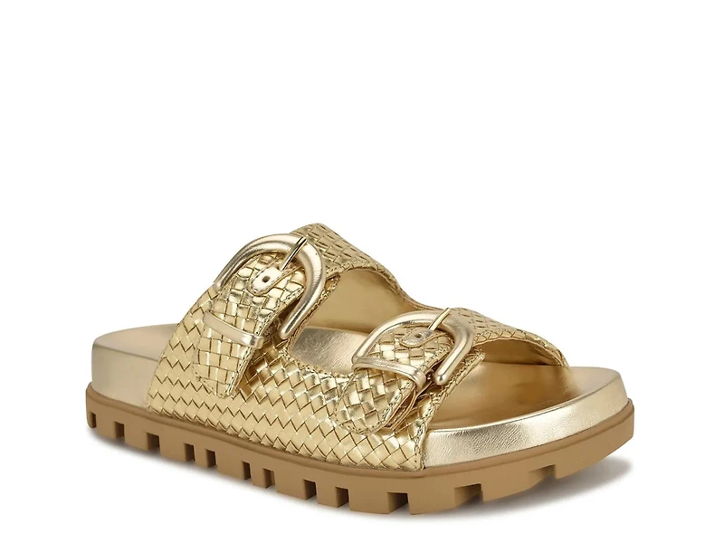 Add a touch of glam to a simple silhouette in the Tindy platform sandals from Nine West. This classic style features a double strap design, a woven upper, and a sleek metallic hue.