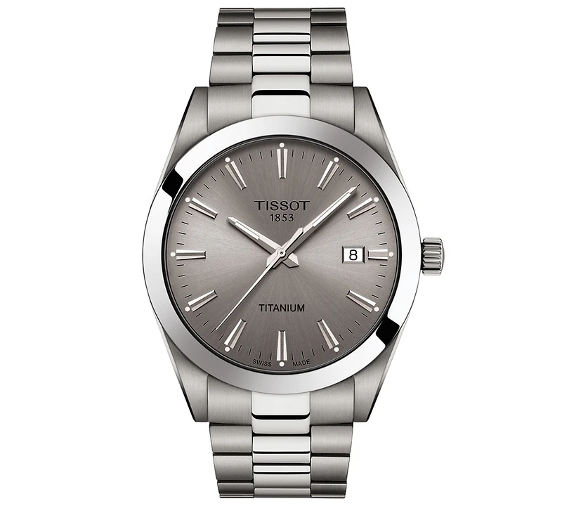 The Gentleman timepiece is a structured design in strong, durable titanium. Swiss-made by Tissot. Style #T1274104404100