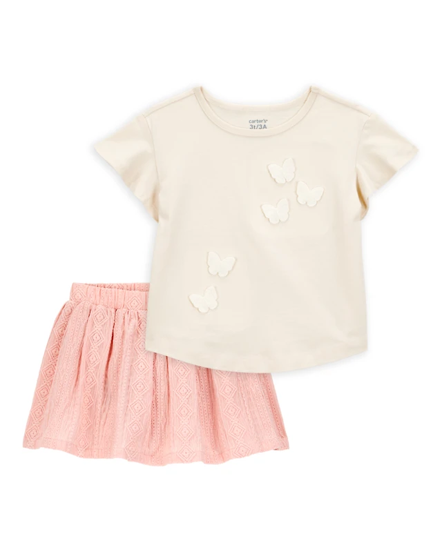 Toddler 2-Piece Butterfly Short-Sleeve Top & Crochet Skort Set - Pink/Ivory