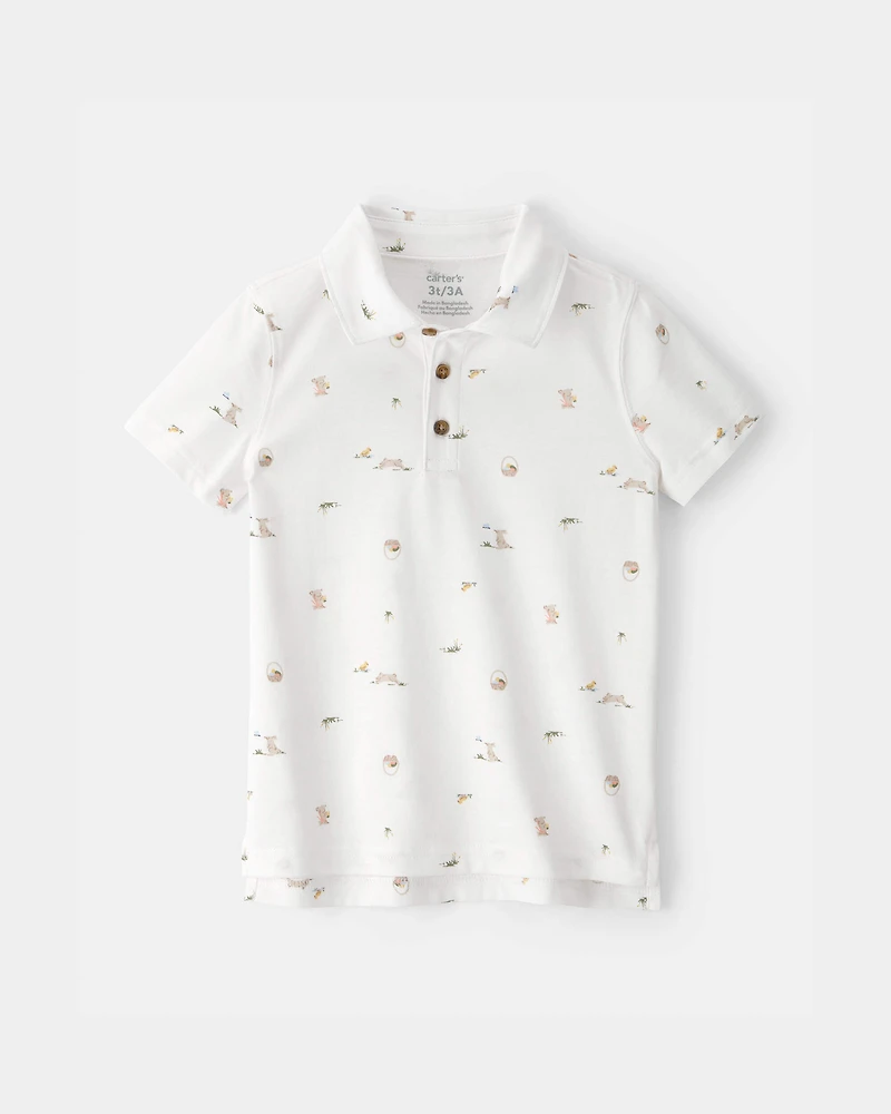 Dress your little one in style this Easter with the Toddler Boy Easter Bunny Polo Shirt - White. This charming polo features a playful bunny print, perfect for festive gatherings. Made from soft, breathable cotton, it ensures all-day comfort while allowing your toddler to move freely. Parents will appreciate the easy button placket that makes dressing a breeze. Whether it’s an Easter egg hunt or a family brunch, this shirt fits the occasion beautifully. Durable and machine washable, it stands up to the adventures of active toddlers. Make this Easter memorable with a touch of style and fun.