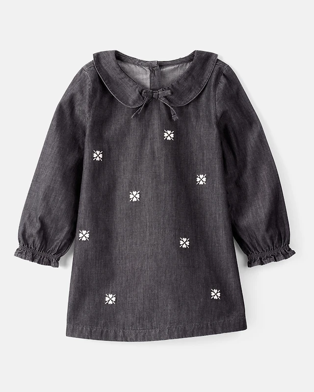 Toddler Girl Floral Motif Chambray Long-Sleeve Dress - Grey