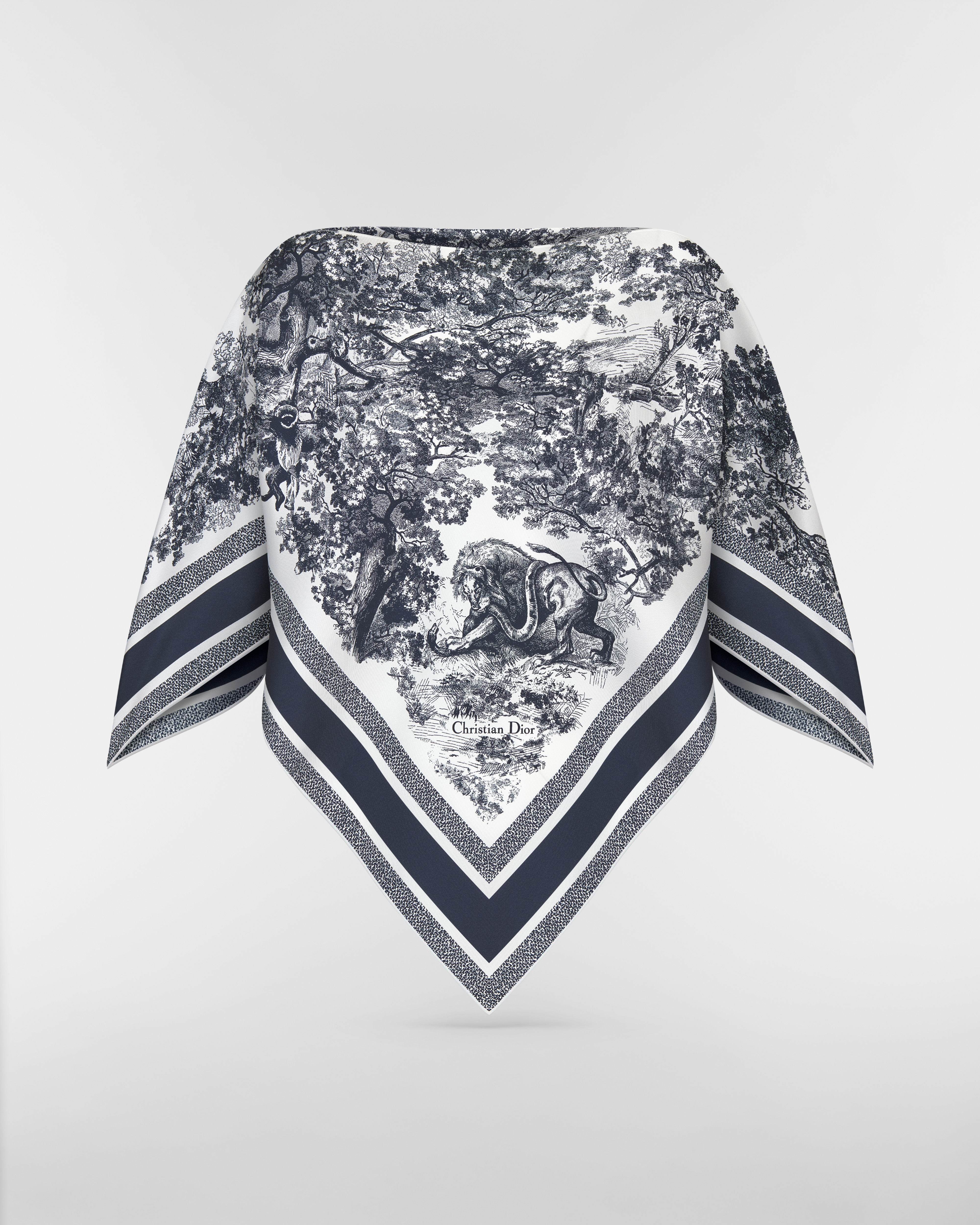 The Dior Silk Top highlights the Toile de Jouy Sauvage print, a new take on the hallmark House motif. Crafted in ecru and navy blue silk twill, the style features hand-rolled edges and is adorned with the Christian Dior signature as well as a contrasting jacquard band. Demonstrating a unique way to wear a silk square scarf, the elegant top slips on over the head and can be paired with pants or a skirt from the collection to complete a Dior look.
