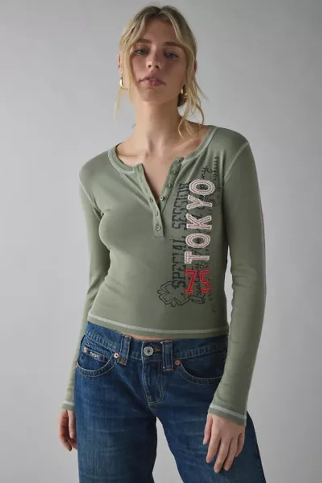 Tokyo Applique Graphic Long Sleeve Henley Tee
