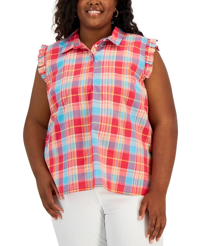 Tommy Hilfiger Plus Plaid Flutter-Sleeve Top