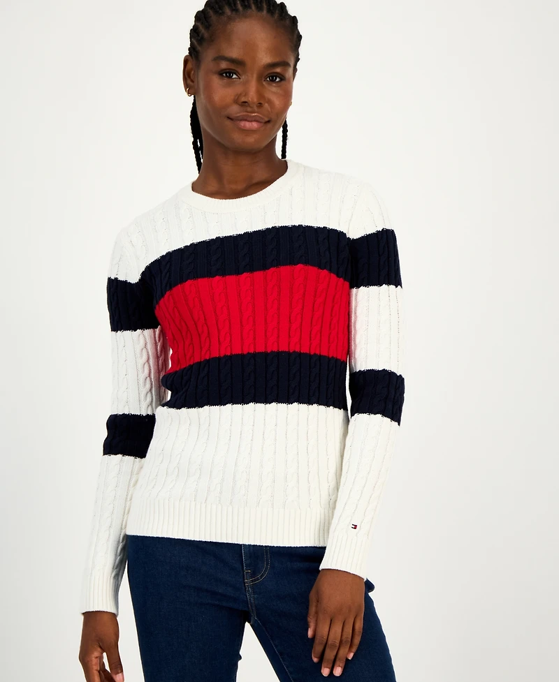 A perfect topper to your favorite jeans, bold colorblocked stripes and a classic cable knit bring eye-catching style to Tommy Hilfiger's cozy cotton sweater.