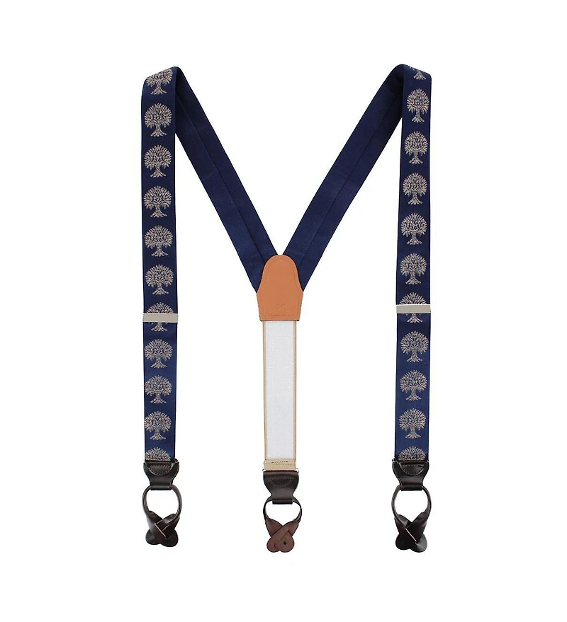 The Heritage Oak Tree Silk Button End suspenders celebrate enduring craftmanship and classic British symbolism. Woven from sumptuous silk, these suspenders feature an elegant oak tree motif rendered in soft metallic tones against a rich navy ground, a timeless emblem of strength, longevity, and tradition. Finished with traditional button ends and hand-finished leather detailing, they offer a distinguished balance of heritage character and modern refinement, ideal for the gentleman who values substance as much as style. Adjustable from 33 to 48 inches long and are 35mm or 1 3/8 inches wide..