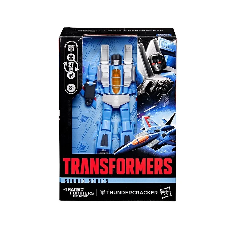 Experience the epic action of The Transformers The Movie with the Studio Series Thundercracker toy The 6.5-inch 16.5 cm figure converts from robot action figure to fighter jet mode in 27 steps. With movie-inspired details, intricate poseability, and blaster accessories that attach in both modes, this Transformers Thundercracker action figure makes an awesome addition to any collection. Look for more Transformers collectible toys sold separately, subject to availability featuring favorite characters like Optimus Prime, Bumblebee, Megatron, and more to create a lineup that is mdash More Than Meets the Eye. Add to your Transformers Studio Series collection and order your Thundercracker Voyager Class from TFSource today