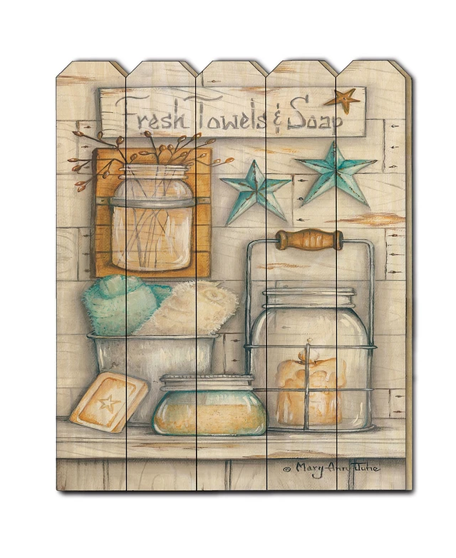 Trendy Decor 4U Fresh Towels Soap by Mary Ann June, Printed Wall Art on a Wood Picket Fence, 16" x 20"