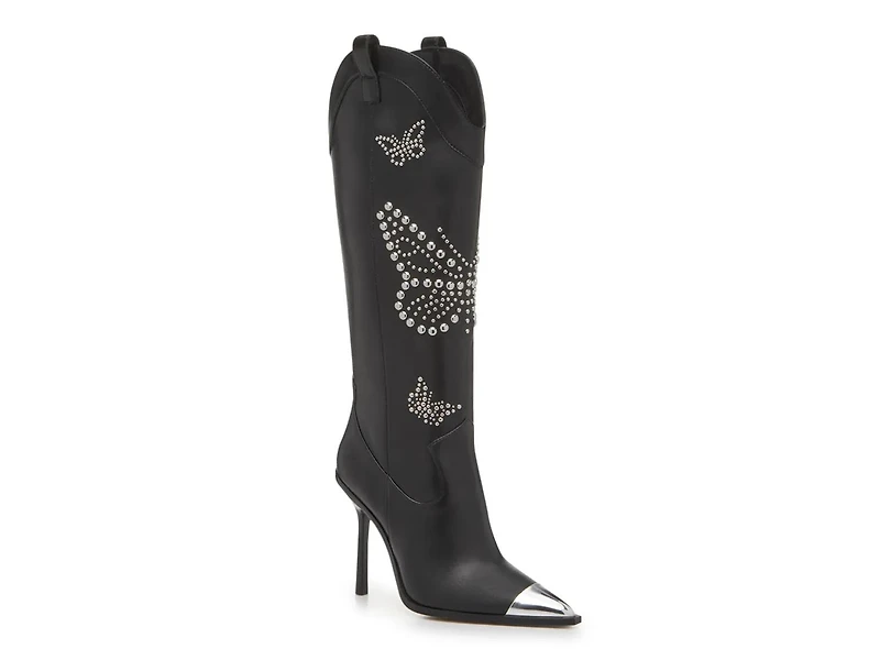 Polish off a country-inspired style with a touch of glam! The Tressi Western boot from Aldo features a cowboy-like style, complete with a high shaft, detailed stitching, and a classic pull-straps on the side. Elevated by elegant details including a sharp stiletto heel, a glossy cap toe, and silvertone studded details in the shape of a butterfly.