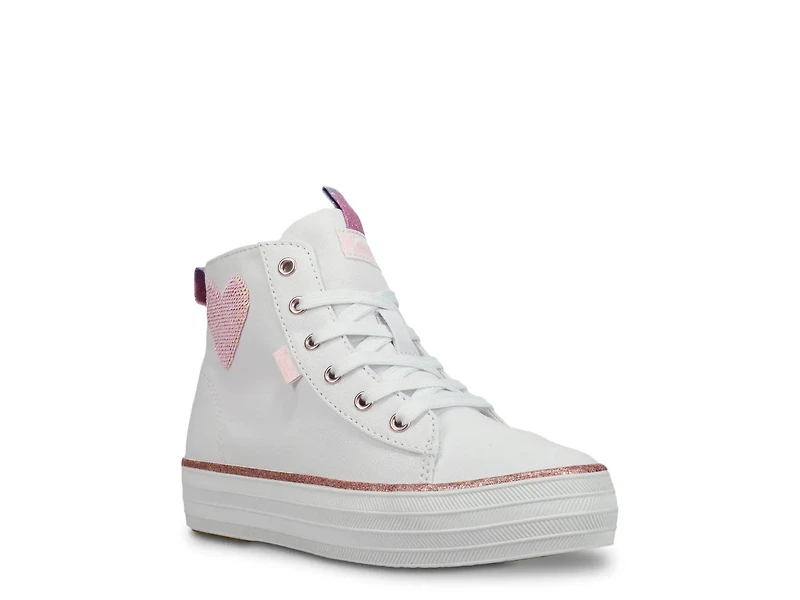 Your kid will be hooked to the sparkly and sporty Keds Triple Up high-top sneaker. A glittery heart accent creates fascination to the chunky platform sneaker, also designed with a glittery heel strip. With an inside zipper, your kid can easily wear and remove at will.