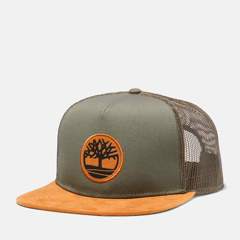 With a breathable mesh back, cotton sweatband, and snap closure, this trucker hat sports a faux-suede flat brim and tree logo patch. It's perfect for warmer weather days.