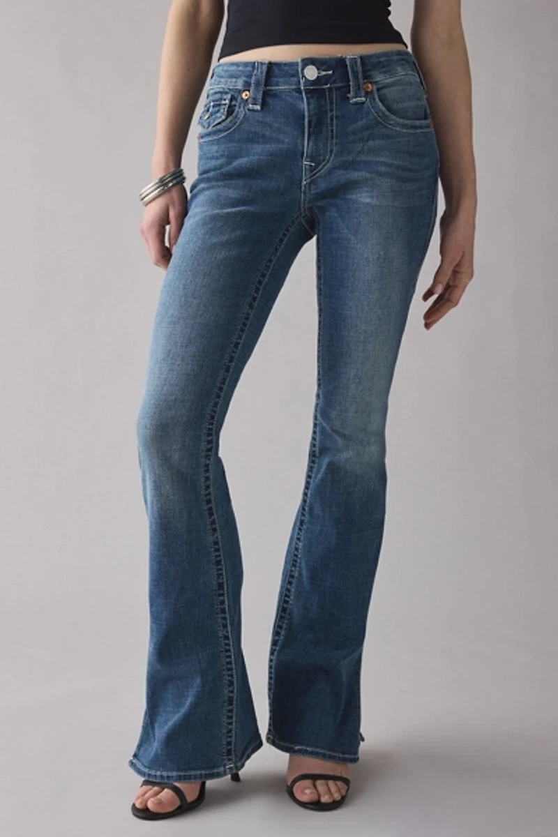 Throwback-style True Religion jeans in a midweight, stretch denim designed to be your new everyday fav. Bootcut jeans featuring a low-rise waistline, classic 5-pocket styling and Big T stitching with horseshoe stitching across the back pockets. Finished with side-slit flared hems for a modern finish!