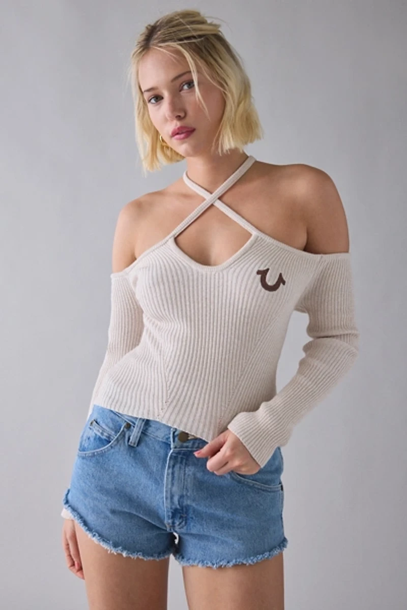 Statement True Religion off-the-shoulder sweater in a sparkling, lurex ribbed knit! Fitted sweater in a slim & cropped fit featuring a v-neckline with crisscross strap details, off-the-shoulder long sleeves and horseshoe embroidery at the chest for a charming finish.