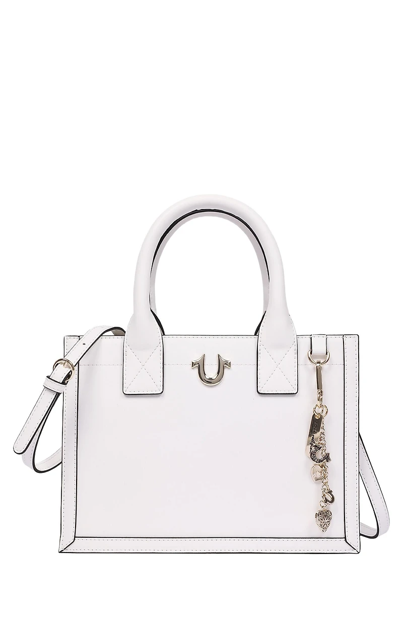 Clean lines meet iconic detail in the True Religion Modern Edge Charm Tote. Designed with a sleek, structured silhouette, this everyday essential is elevated by polished hardware, signature horseshoe branding, and a removable multi-charm chain that adds a touch of attitude and shine. Available in Black, White, and Red, this tote transitions effortlessly from day to night. Dual top handles provide a refined hand-carry look, while the removable, adjustable crossbody strap offers hands-free versatility. The structured interior opens to a spacious compartment with branded lining, making it perfect for carrying daily essentials without sacrificing style. Finished with contrast stitching and True Religion's unmistakable edge, this tote is a modern classic, bold, polished, and endlessly versatile.