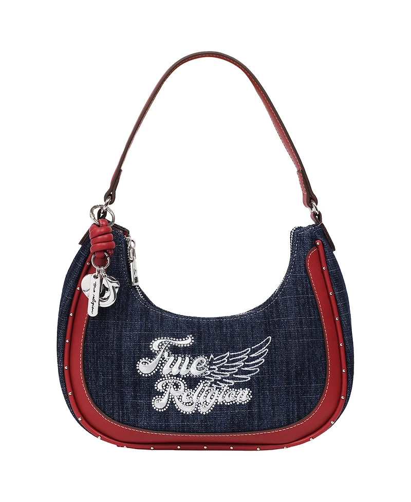 True Religion Wing Motif Denim Hobo Bag with Red Trim