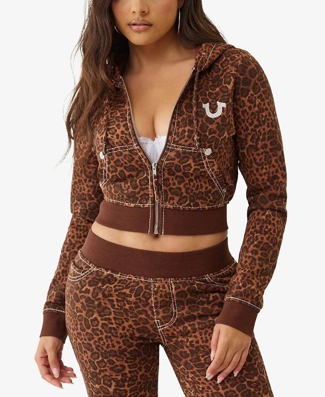 True Religion Women's Big T Crystal Leopard Shrunken Hoodie