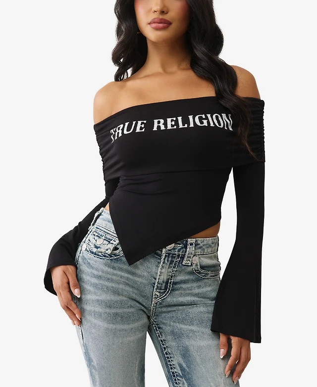 True Religion Women's Crystal Asymmetric Off The Shoulder Top