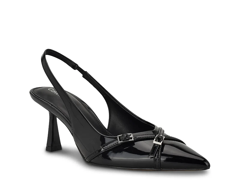 The Tulissa 2 pump from Calvin Klein exudes sophistication with its flared heel, pointed toe, and patent shine. This slingback features decorative buckles for a touch of edge.
