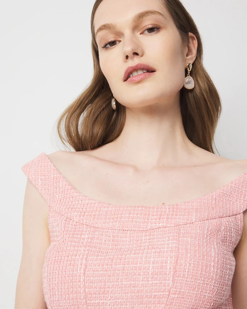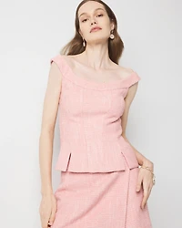 Designed with skin-baring “at the shoulder” straps, princess seams and side slits, this tweed top is a polished + flirty style. For a complete (and super cute) look pair this top with matching Tweed Skort.