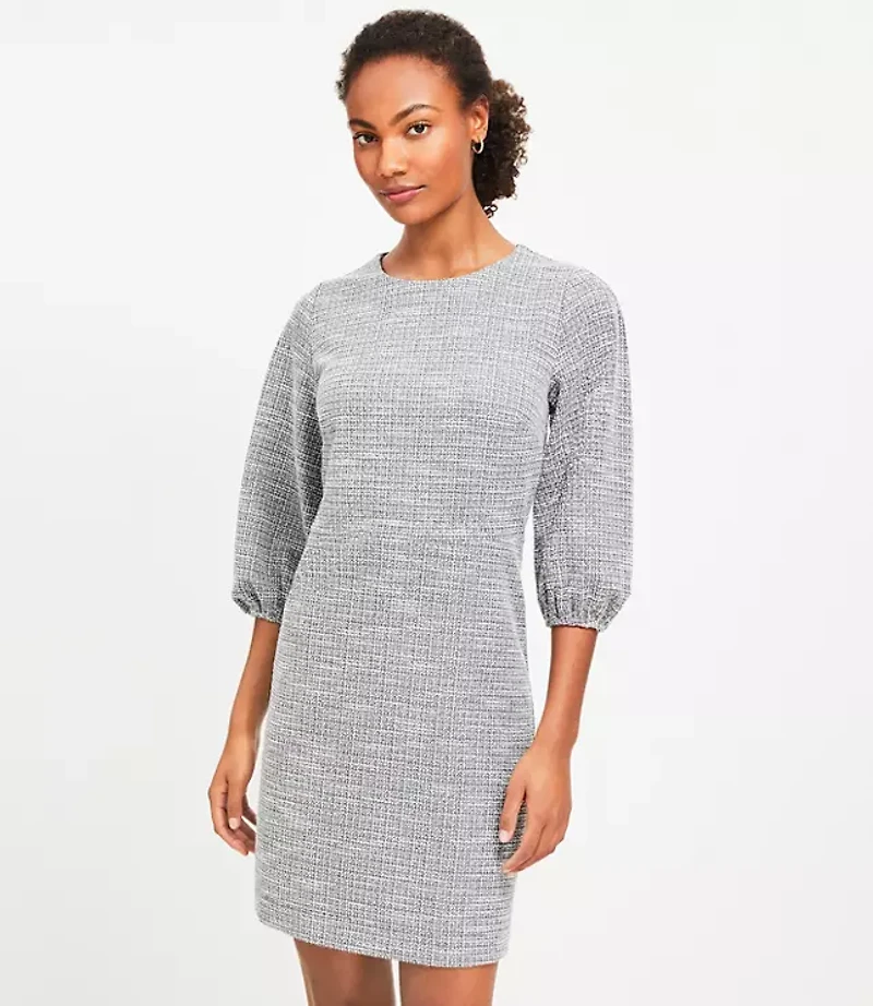 A sleek shift in smart tweed, this structured knit dress is a modern - chic statement prettied up by blouson sleeves. Round neck 3/4 sleeves with elasticized cuffs. Back zip Lined body, unlined sleeves., Imported:, Fit: Waisted - fits and flatters waist, Length: 34 1/2"from center back neck to hem, measured from a size 8 / M, Fabrication: Shell 79% Polyester 11 Rayon 8 Cotton 1 Spandex Other Fiber, Lining: 100% Polyester, Garment Care: Machine Washable Loft Tweed Mini Dress Size 8 Black Tweed Women's by Loft Size Regular - 8 Black Multi Tweed Women's Fit, & Flare Dresses Work Shell: 79% Polyester 11% Rayon 8% Cotton 1% Spandex 1% Other Fiber Lining: 100% Polyester Machine Washable