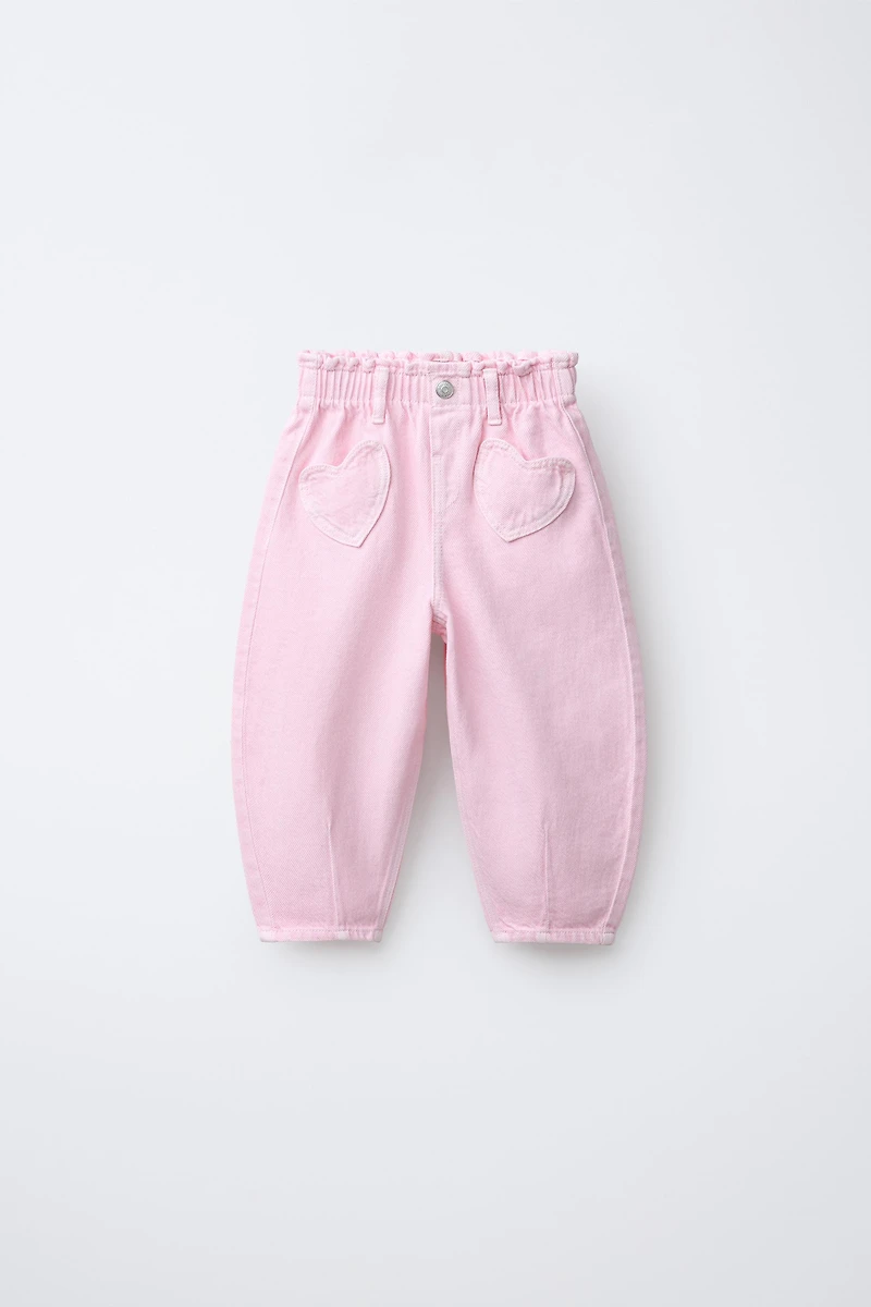 Baggy pants with elastic waistband and snap button closure. Front patch heart-shaped pockets.