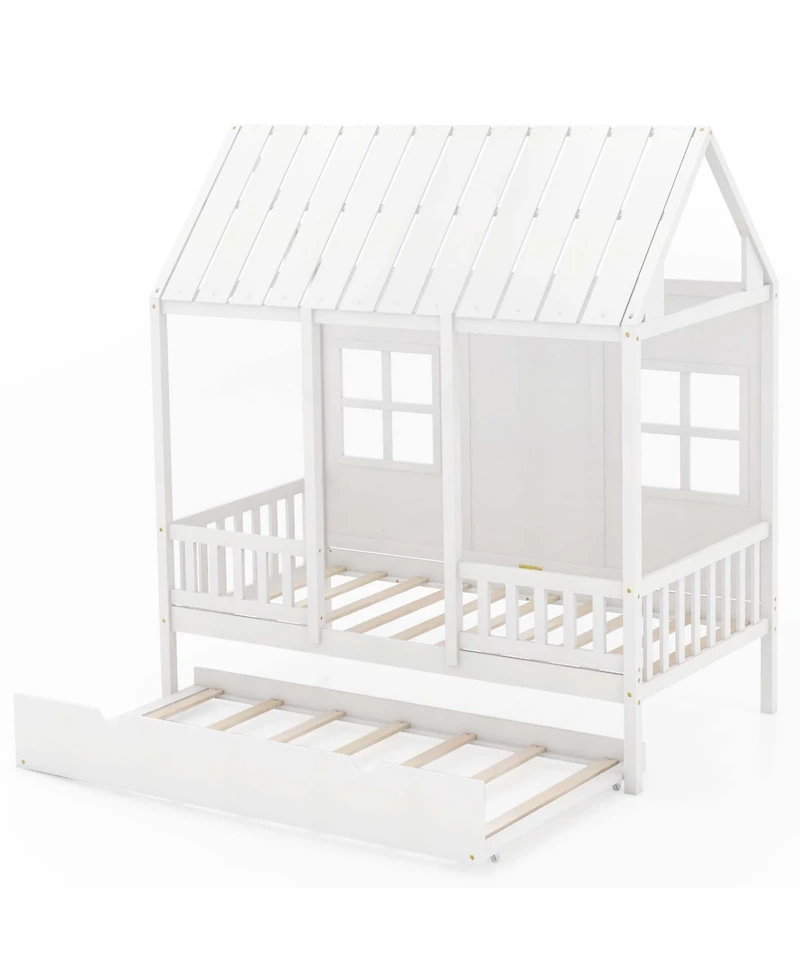 Twin Size House Bed with Trundle Fence Decor Wooden Windows Tall Roof