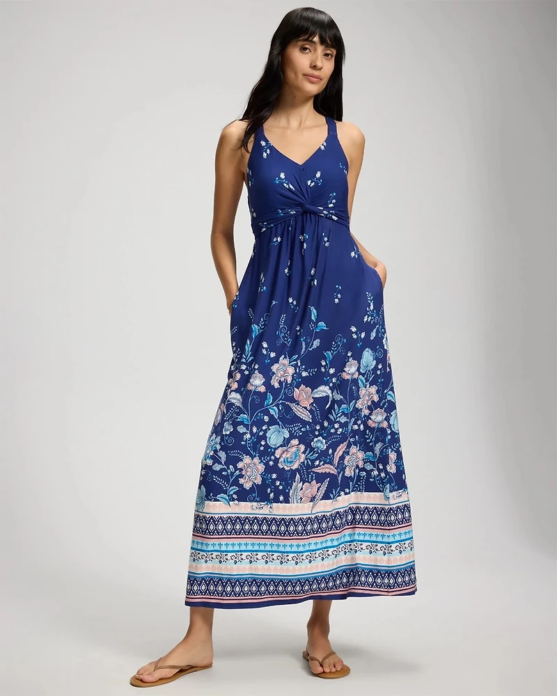 Take your spring and summer style to the max in this super soft maxi dress with an eye-catching twist-front and crossback design. Did we mention the removable cups for support? Bonus—it has pockets too. This dress has it all!