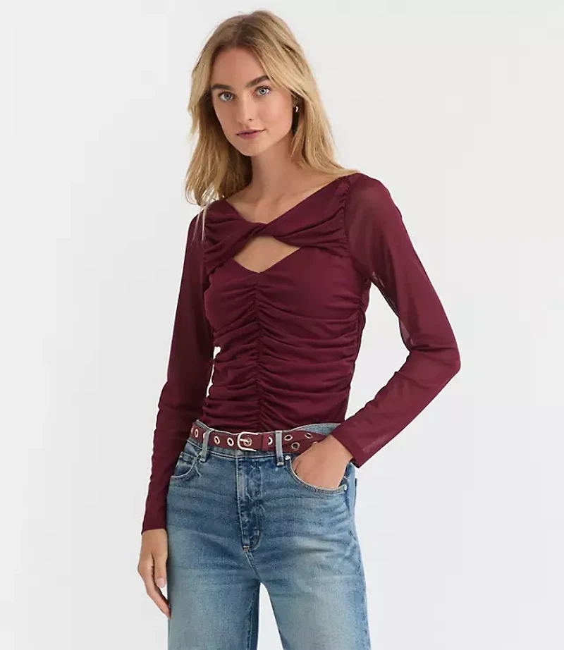It's soft and comfy, it's modern and chic, it's pulled - together and flattering - this ruched twist neck top is an everyday game - changer. Twist cutout sweetheart neckline. Long sleeves, Bullet1: 22 1/2"long, Imported:, Fit: Slim streamlined to fit close the body, Length: Regular - hits below natural waist, Fabrication: 93% Polyester 7 Spandex, Garment Care: Machine Washable Loft Twist Neck Ruched Top Size 2XS Black Women's by Loft Size Regular - 2XS Black Women's Polyester / Poly, Blend Boatneck Long Sleeve Blouse Tops Wear to Work 93% Polyester 7% Spandex Machine Washable