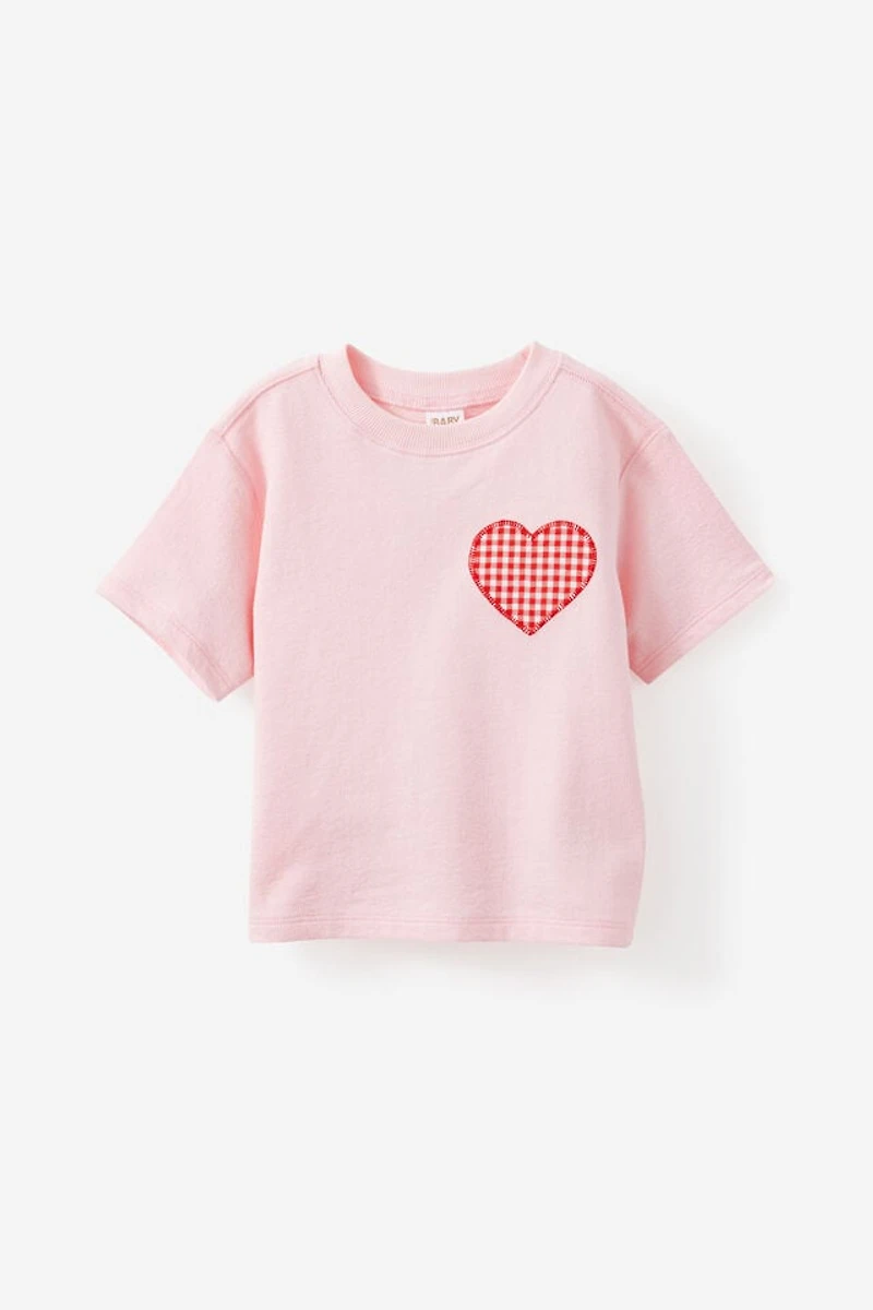 For every cuddle and every gummy smile. Meet the Tyla Knit Tee, a soft cotton tee made for daytime cuddles. The oversized fit and drop shoulder give them plenty of room to wriggle, while the crew neck with a ribbed band keeps its shape. Easy cotton comfort in blush pink with a gingham heart graphic.